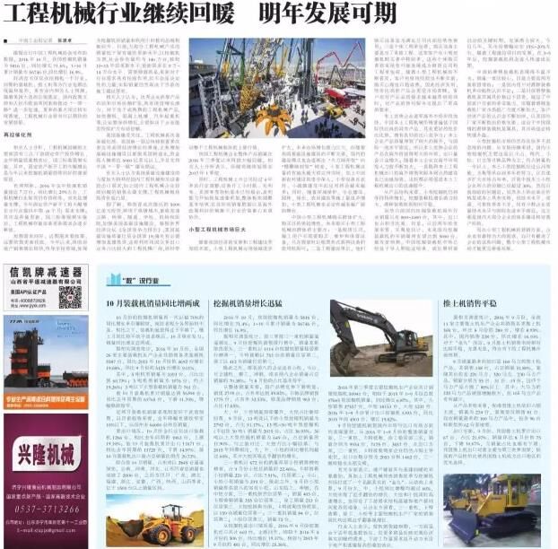 我國工程機械企業(yè)整體產(chǎn)品銷量在2016年三季度以來得到大幅回暖,相關(guān)人士分析表示,回暖將繼續(xù)延續(xù)至2017年1季度。