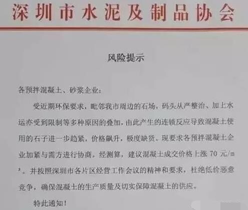 受近期商品混凝土原材料(碎石、砂)持續(xù)漲價(jià)的影響,深圳市水泥及制品協(xié)會(huì)終于發(fā)布商品混凝土、預(yù)拌砂漿企業(yè)風(fēng)險(xiǎn)提示函,表示,因原材料價(jià)格持續(xù)上漲,商品混凝土價(jià)格建議,上調(diào)70元/立方米。目前,深圳市及周邊地區(qū)大多數(shù)混凝土企業(yè)混凝土價(jià)格已經(jīng)上調(diào),瘋狂的石頭再次上演【漲、漲、漲】何時(shí)能夠穩(wěn)定一來,還有待觀望。