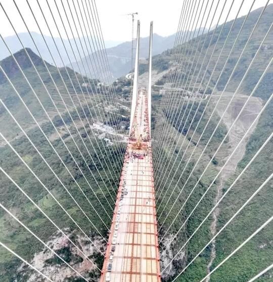 大橋為七跨連續(xù)鋼桁梁斜拉橋,全長1341.4米,主跨達到720米,在鋼桁梁斜拉橋中跨度排名世界第二。如此高的高度,如此龐大的橋體,能橫亙在大峽谷兩岸而穩(wěn)如泰山,橋上的斜拉索體系起著至關(guān)重要的作用。