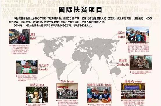 從2005年援助印尼海嘯開始,截至2016年底,中國扶貧基金會已在17個國家或地區(qū)總投入約1.12億元,涉及緊急救援、設備援助、NGO能力建設、醫(yī)院建設、學校供餐、大學生資助及社區(qū)綜合發(fā)展等項目,受益人數(shù)約30萬人次。2016年,我會國際項目籌集資金1699萬元,幫助55623人次。