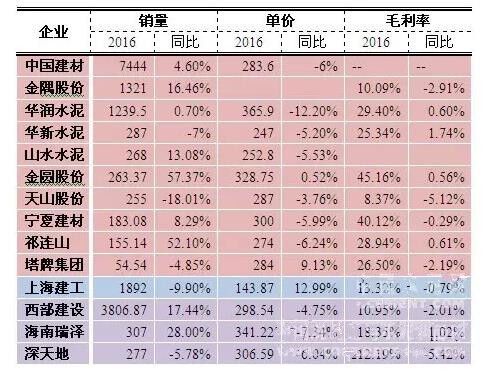 2016年,全國(guó)商品混凝土產(chǎn)量17.9億立方米,同比增長(zhǎng)7.4%,混凝土與水泥制品行業(yè)實(shí)現(xiàn)利潤(rùn)總額658億元,同比增長(zhǎng)4.1%。從上市企業(yè)來看,14家由混凝土業(yè)務(wù)經(jīng)營(yíng)的企業(yè)總銷量同比增長(zhǎng)6.25%,但由于大部分企業(yè)混凝土銷售價(jià)格出現(xiàn)回落,導(dǎo)致13家企業(yè)(除金隅股份)整體銷售收入同比只有1.25%的提升,而11家企業(yè)(除中國(guó)建材、金隅股份、山水水泥)整體毛利潤(rùn)同比下滑3.3%。