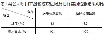 優(yōu)質(zhì)的粉煤灰摻入混凝土可明顯地改善混凝土的和易性,當(dāng)粉煤灰摻量大于膠材總量的5%~10%時(shí),效果極為明顯?,F(xiàn)今在混凝土實(shí)際生產(chǎn)中,粉煤灰摻量往往達(dá)到20%,有的甚至高達(dá)30%,但混凝土的和易性卻不盡人意。抽取原材料進(jìn)行檢測(cè)時(shí),發(fā)現(xiàn)粉煤灰的檢測(cè)結(jié)果經(jīng)常不滿足標(biāo)準(zhǔn)要求或者與驗(yàn)收時(shí)的結(jié)果相差甚遠(yuǎn)?,F(xiàn)以某公司所用Ⅱ級(jí)粉煤灰進(jìn)場(chǎng)及抽樣常規(guī)檢測(cè)結(jié)果進(jìn)行對(duì)比,見表1。