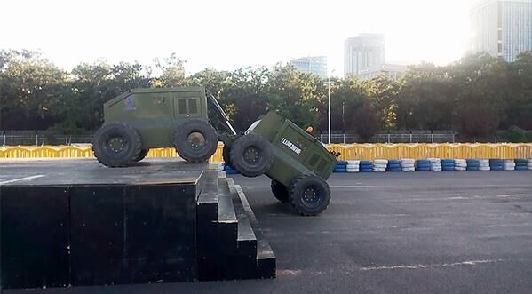 在翻越障礙物的過程中,車體姿態(tài)靈活變化,輕松攀越高臺,現(xiàn)場驚嘆與掌聲不斷。
