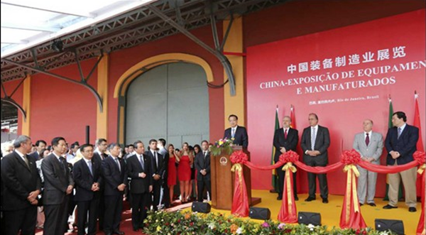 當(dāng)?shù)貢r(shí)間20日,李克強(qiáng)在里約熱內(nèi)盧州州長(zhǎng)佩藏和巴西外長(zhǎng)維埃拉的陪同下來(lái)到里約民港碼頭,參觀正在這里舉辦的中國(guó)裝備制造業(yè)展覽,并為展覽開幕剪彩。展覽包括鐵路及軌道交通、電力、通信、金融等10個(gè)板塊,代表國(guó)內(nèi)裝備制造業(yè)最高水平的30家中國(guó)企業(yè)參展。