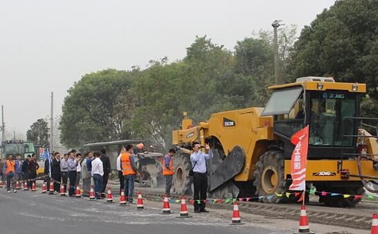 參會嘉賓、客戶參觀了臨邑316省道改造工程橋林段徐工XM200K銑刨機、徐工XLZ230K、XLZ2103路面冷再生機的施工現(xiàn)場實戰(zhàn)演示。一到現(xiàn)場,一組嘉賓們嘉賓興致勃勃的圍住了正在作業(yè)該項目最后幾公里的XM200K銑刨機,只見XM200K銑刨機行走平穩(wěn),身手矯健,銑出的填料坑邊側(cè)及底部整齊、深度均勻,齒狀幾何表面筆直平整,從事多年養(yǎng)護施工的嘉賓們發(fā)出了“漬漬”的稱贊聲;另一組嘉賓則在XLZ230K、XLZ2103路面冷再生機的施工段過飽了眼福,只見XLZ230K路面冷再生機力大無窮、功能全面,銑刨、破碎、加料、灑水、拌合、攤鋪和預(yù)壓一次完成,現(xiàn)場測量結(jié)果顯示銑刨深度大于450mm,超出客戶的預(yù)期,徐工XLZ230K路面冷再生機獲得了在場用戶的一致好評。