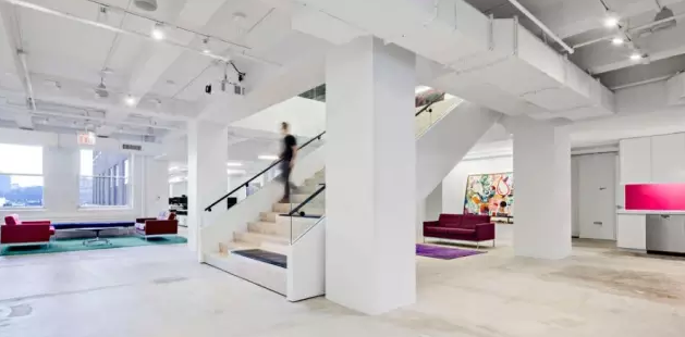 辦公空間大面積采用混凝土材料整體地坪,與現(xiàn)代風(fēng)格的軟裝相互搭配,偶爾點(diǎn)綴期間的鮮活色彩,在整體純色空間形成對比,粗獷與精致相互交融,打造出全然開放通透、時尚簡約的空間環(huán)境。
