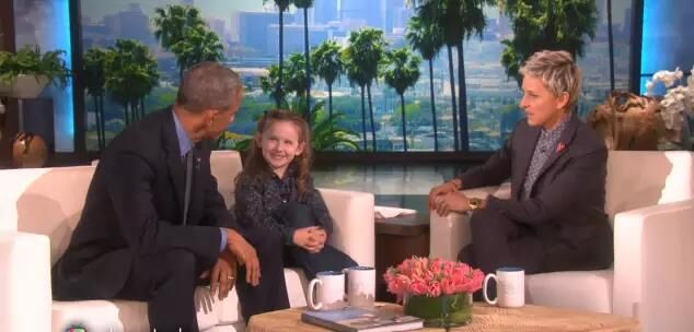 在本次節(jié)目中,主持人狄珍妮(Ellen DeGeneres)首先歡迎6歲的「總統(tǒng)專家」?jié)h斯利(Macey Hensley)出場(chǎng)。這名可愛的小女孩揮著手走出來,先后擁抱奧巴馬和狄珍妮。