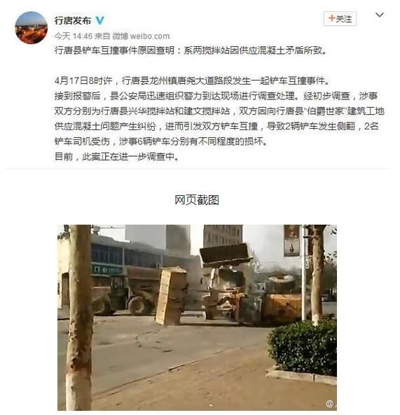 17日8時許,行唐縣發(fā)生鏟車互撞事件。經(jīng)警方初步調(diào)查,涉事雙方為行唐縣兩攪拌站,因向某建筑工地供應(yīng)混凝土問題產(chǎn)生糾紛,進(jìn)而沖突。致2輛鏟車發(fā)生側(cè)翻,2名鏟車司機(jī)受傷,涉事6輛鏟車分別有不同程度的損壞。該案還在進(jìn)一步調(diào)查中。