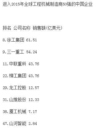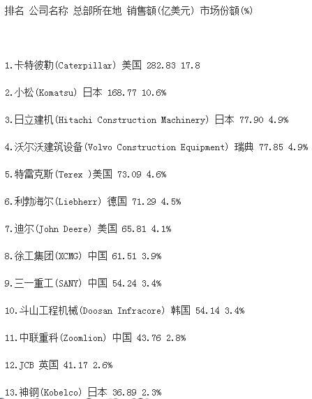 分析指出,受大宗商品價(jià)格下跌、新型經(jīng)濟(jì)體經(jīng)濟(jì)增速減緩和世界經(jīng)濟(jì)不景氣的影響,全球前50家工程機(jī)械制造企業(yè)總產(chǎn)值較上一年度下跌16.2%,達(dá)到1330億美元,創(chuàng)2009年以來(lái)新低。據(jù)中國(guó)工程機(jī)械商貿(mào)網(wǎng)編輯了解,2009年,工程機(jī)械行業(yè)一年銷售額下降了1090億美元。自那時(shí)起,工程機(jī)械行業(yè)收入下降趨勢(shì)一直未有改變。報(bào)告同時(shí)強(qiáng)調(diào),榜單上下滑最為嚴(yán)重的是中國(guó)企業(yè),這很大程度上是因?yàn)橹袊?guó)經(jīng)濟(jì)增速的放緩。中國(guó)企業(yè)中,只有徐工集團(tuán)仍然保持在前十強(qiáng),位列榜單第九位?!斑@個(gè)市場(chǎng)趨勢(shì)表現(xiàn)最顯著的就是中國(guó)建筑設(shè)備制造商,相比去年,所有中國(guó)企業(yè)的排名有所下滑。排名前十的企業(yè)中,如今只有徐工一家中國(guó)工程機(jī)械制造廠商?!?/span>