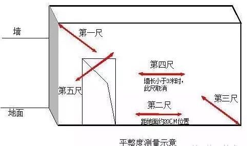 三、表面平整度1、指標(biāo)說明:反映層高范圍內(nèi)剪力墻、混凝土柱表面平整程度。2、測量工具:2米靠尺、楔形塞尺3、測量方法和數(shù)據(jù)記錄:(1)剪力墻/暗柱:選取長邊墻,任選長邊墻兩面中的一面作為1個實測區(qū)。累計實測實量不少于5個實測區(qū)。(2)當(dāng)所選墻長度小于3米時,同一面墻4個角(頂部及根部)中取左上及右下2個角。按45度角斜放靠尺,累計測2次表面平整度??缍纯诓课槐販y。這2個實測值分別作為該指標(biāo)合格率的2個計算點。(3)當(dāng)所選墻長度大于3米時,除按45度角斜放靠尺測量兩次表面平整度外,還需在墻長度中間水平放靠尺測量1次表面平整度??缍纯诓课槐販y。這3個實測值分別作為判斷該指標(biāo)合格率的3個計算點。(4)混凝土柱:可以不測表面平整度。4、示例: