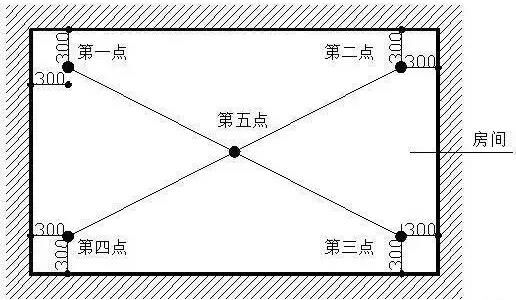 五、頂板水平度極差1、指標(biāo)說明:考慮實際測量的可操作性,選取同一功能房間混凝土頂板內(nèi)四個角點和一個中點距離同一水平基準(zhǔn)線之間5個實測值的極差值,綜合反映同一房間混凝土頂板的平整程度。2、測量工具:激光掃平儀、具有足夠剛度的5米鋼卷尺(或2米靠尺、激光測距儀)3、測量方法和數(shù)據(jù)記錄:(1)同一功能房間混凝土頂板作為1個實測區(qū),累計實測實量不得少于3個實測區(qū)。(2)使用激光掃平儀,在實測板跨內(nèi)打出一條水平基準(zhǔn)線。同一實測區(qū)距頂板天花線約30cm處位置選取4個角點,以及板跨幾何中心位(若板單側(cè)跨度較大可在中心部位增加1個測點),分別測量混凝土頂板與水平基準(zhǔn)線之間的5個垂直距離。以最低點為基準(zhǔn)點,計算另外四點與最低點之間的偏差。最大偏差值≤15mm時,5個偏差值(基準(zhǔn)點偏差值以0計)的實際值作為判斷該實測指標(biāo)合格率的5個計算點。最大偏差值﹥15mm時,5個偏差值均按最大偏差值計,作為判斷該實測指標(biāo)合格率的5個計算點。4、示例: