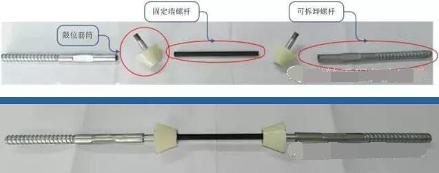 根據(jù)對日本已完清水混凝土工程考察結(jié)果,日方在施工中均采用三接頭的對拉螺桿,施工中有效解決了螺桿眼部位的失水漏漿的問題,有效避免了熊貓眼的發(fā)生。為了有效保護(hù)清水模板的表面,通過多輪試驗對比,特別研制出了五段式對拉螺桿。