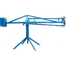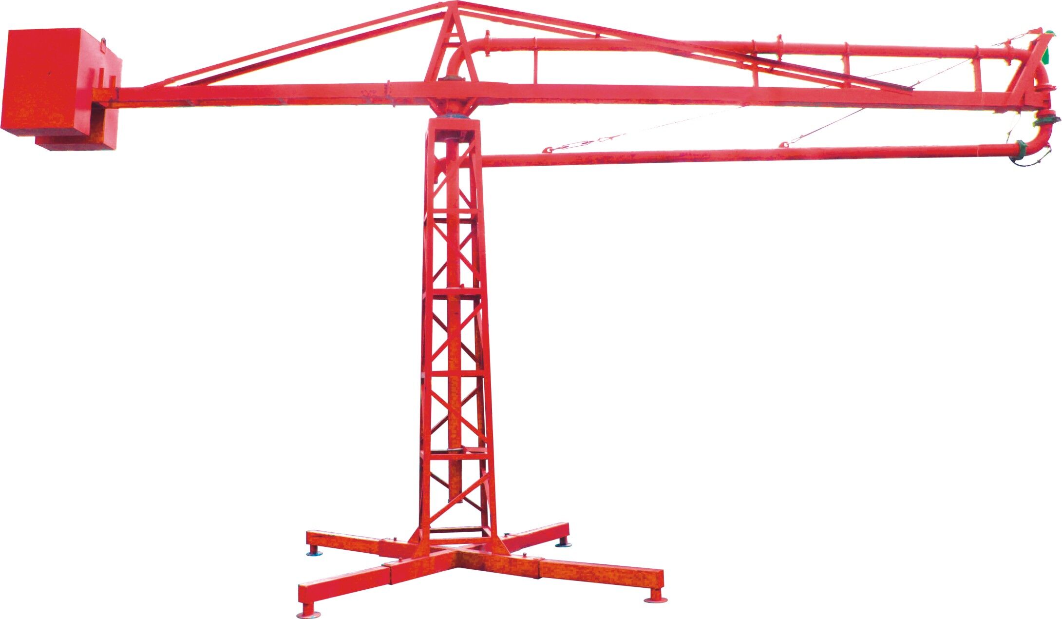 結(jié)構(gòu):、插銷、立架、構(gòu)成的底座是固定部分,其上通過回轉(zhuǎn)支承與上部回轉(zhuǎn)部分相連,上主梁架、平衡臂、平衡臂架拉桿、上橫桿組成后回轉(zhuǎn)部分。立管上有回轉(zhuǎn)卡篐接頭。通過人力拉動(dòng),可使整個(gè)回轉(zhuǎn)部分回轉(zhuǎn)360度。上梁主架前端連接有一個(gè)回轉(zhuǎn)支座與前橫桿、前拉桿組成前回轉(zhuǎn)部分,在人力拉動(dòng)下可繞回轉(zhuǎn)支座旋轉(zhuǎn)300度。由兩部分回轉(zhuǎn)架組成的合成運(yùn)動(dòng)就能覆蓋所有布料半徑范圍的布料點(diǎn)。