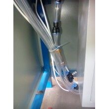 將膩?zhàn)臃郯b袋套在出料嘴上,撥動(dòng)彈簧開關(guān),壓袋氣缸開始工作并壓住袋口,控制器將包裝袋重量自動(dòng)去除,通過空壓機(jī)的氣流經(jīng)三分管分成三路,其中一路去往進(jìn)料口進(jìn)行破拱,保證下料暢通。葉輪高速轉(zhuǎn)動(dòng)迅速將物料撥出灌入袋中,隨袋中空氣一起溢出的粉塵經(jīng)排氣孔排出(對環(huán)保要求高的用戶也可連接吸塵器,由除塵器吸走)。待加料達(dá)到粗流設(shè)定值(L1)時(shí),氣缸自動(dòng)將橡膠軟管夾至1/2開口,出料速度減慢,到總設(shè)定(L2)時(shí),氣缸將橡膠軟管完全夾死,出料停止,壓袋氣缸松開袋口,灌裝結(jié)束。