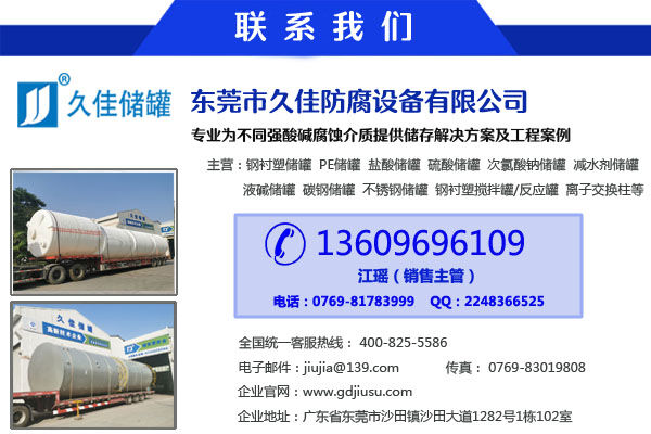 找質量上乘、服務一流的鋼襯塑樹脂罐攪拌罐供應商,選東莞市久佳防腐設備有限公司,公司是華南地區(qū)知名的防腐鋼襯塑攪拌罐生產(chǎn)廠家,引進國外先進的技術設備以及滾塑工藝,品質保證。生產(chǎn)的防腐攪拌罐、鋼襯塑儲罐具有無焊接縫、不滲漏、耐腐蝕,抗老化,抗沖擊,表面光滑結合力強。對一般酸堿鹽的有機溶劑性能良好,適用于腐蝕性氣體,液體及固體液,漿液介質的攪拌以及儲存輸送。