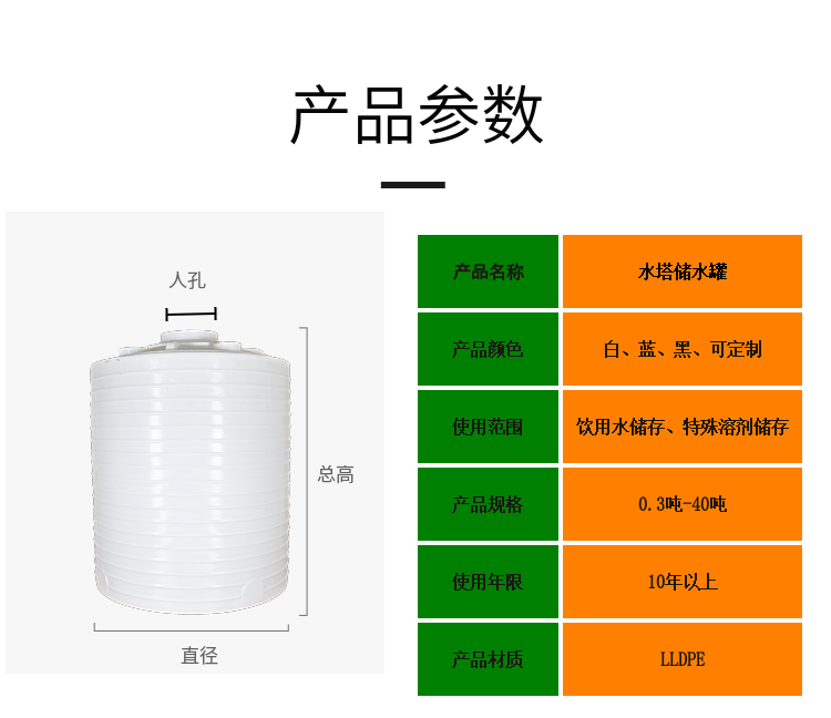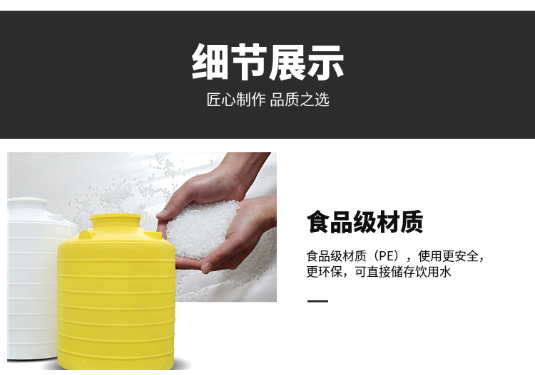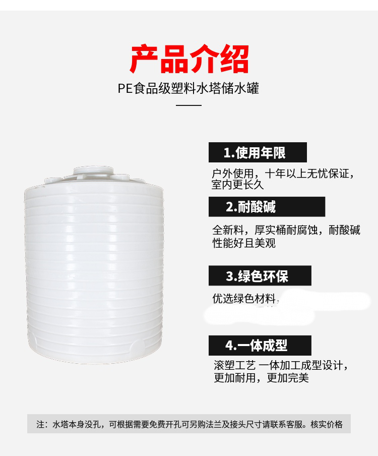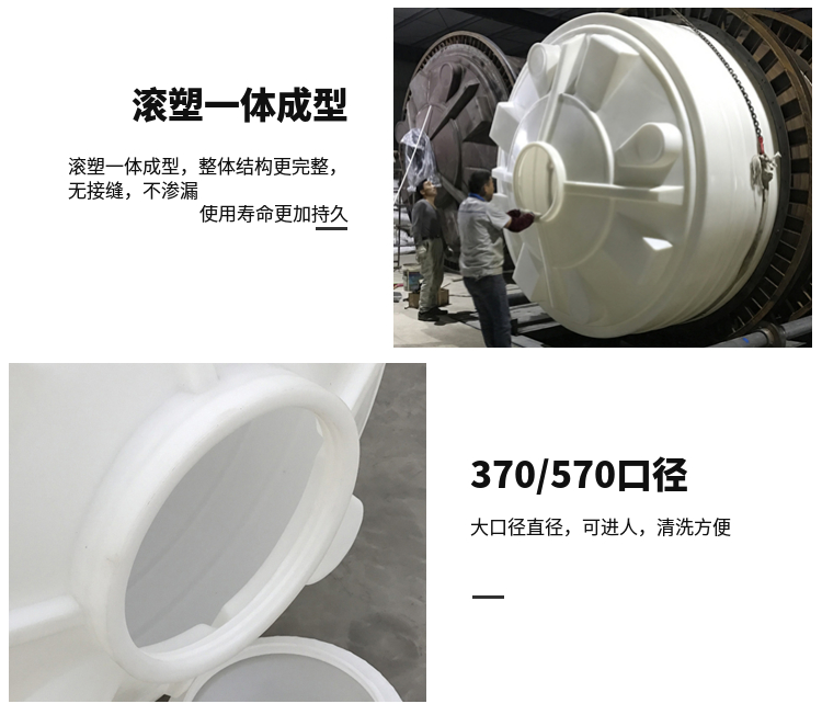2、PE儲罐無焊縫塑料(聚乙烯)儲運設(shè)備系列:本系列產(chǎn)品以本公司獨特配方改性增加聚乙烯(PE)為原料,采用特殊工藝整體一次成型(滾塑成型工藝)。這種塑料儲罐在生產(chǎn)中沒有使用任何添加劑、塑料填料,完全由本公司獨特配方改性增加聚乙烯(PE)材料加工制作而成,從儲罐罐體到進(jìn)出料口、人孔、法蘭等都為整體一次成型無焊接縫,所以儲罐還具有不焊接縫、不滲漏、無毒性、重量輕、抗老化、抗沖擊、耐腐蝕、壽命長、符合衛(wèi)生標(biāo)準(zhǔn)等特性,其價格大大低于不銹鋼儲罐、普通玻璃鋼儲罐、聚丙烯儲罐、聚氯乙烯貯罐,自然條件下的使用壽命更長。