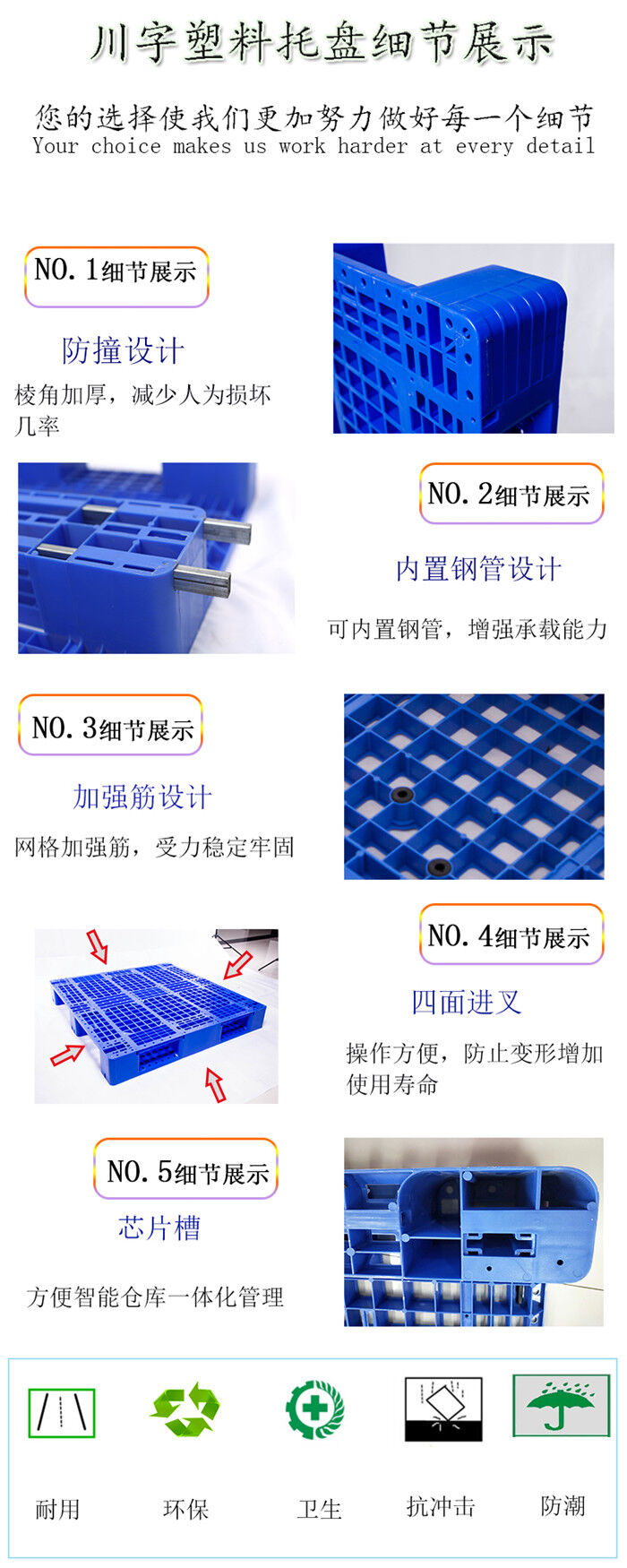 使用方式:本公司生產(chǎn)的塑料托盤通過ISO9001:2000質(zhì)量體系認(rèn)證,具有安全、衛(wèi)生、環(huán)保,使用壽命長、使用便捷、、無釘無刺、無味無毒、耐酸、耐堿、耐腐蝕,易沖洗消毒、不腐爛、不助燃、無靜電火花、耐高溫、耐低溫、可回收、質(zhì)量輕、美觀、強度高等特點,主要原料為進(jìn)口聚乙烯,是現(xiàn)代運輸、倉儲、包裝的重要工具。根據(jù)國際潮流,吸取日本德國技術(shù),結(jié)構(gòu)設(shè)計合理,標(biāo)準(zhǔn)系列塑料托盤是用途*為廣泛的一種,可在地面使用堆垛,四向進(jìn)叉。